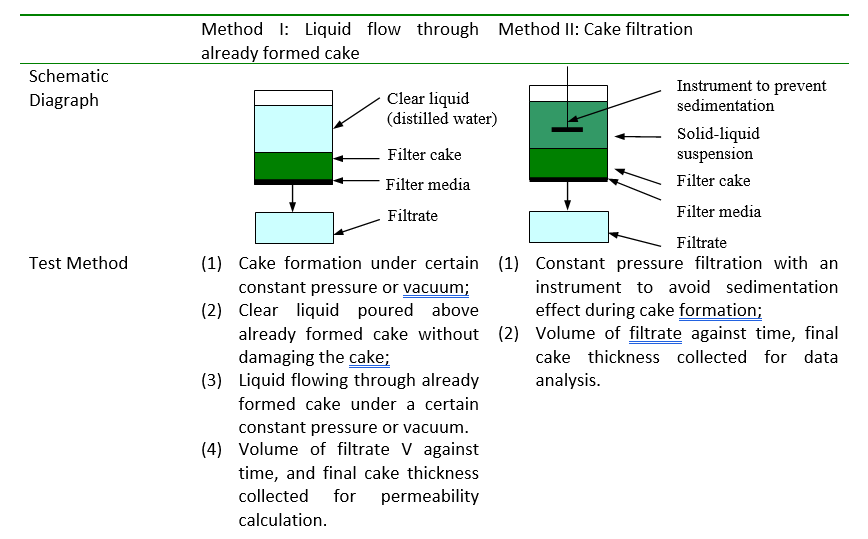 There are two methods in permeability determination: the liquid flowing through already formed cake approach (Method I) and the cake filtration approach (Method II). A detailed comparison of the two methods including test methods and fundamental basis is shown in the Table.