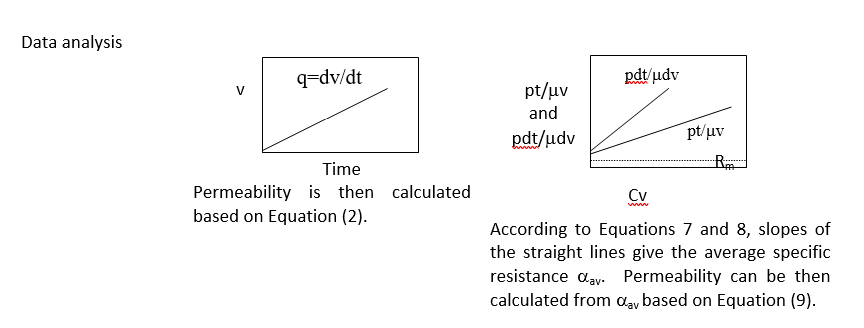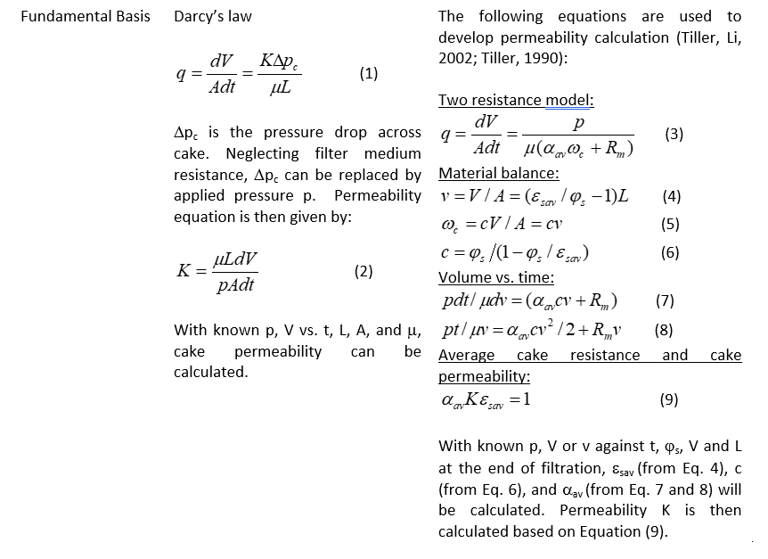 The Method II approach is based on fundamental filtration theory (Tiller, 1990, 2002) assuming there is no effect of sedimentation during cake formation, and a parabolic volume of filtrate vs. time curve. The equipment and calculations are more complicated. However, it include filter media resistance, and gives dynamic permeability during cake formation period under constant pressure, or varying pressure tests. It can be also used to test cake permeability or filterbility of solid-liquid suspensions including highly compactible materials.
