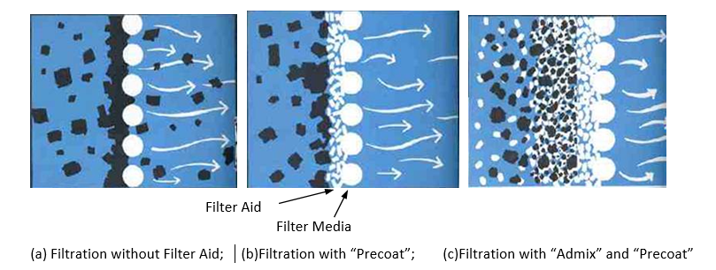 “Filter Aids” is a group of inert materials that can be used in filtration pretreatment. There are two objectives related to the addition of filter aids. One is to form a layer of second medium which protects the basic medium of the system. This is commonly referred to as “precoat”. The second objective of filter aids is to improve the flow rate by decreasing cake compressibility and increasing cake permeability. This type of usage is termed as “admix” or “body feed”. Filtration without filter aid, with precoat, and with precoat and body feed is shown in Fig. 1 (Eagle-Pitcher Minerals, Inc., 1970).
