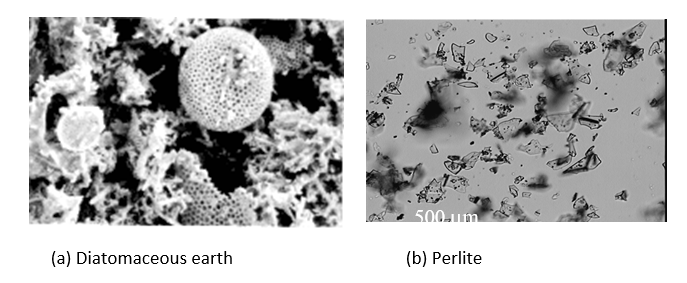 The common filter aids are diatomaceous earth (DE), perlite, cellulose and others. Diatomaceous earth (DE) is the skeleton of ancient diatoms (Fig. 2a). They are mined from ancient seabed, processed, and classified to make different grade of filter aids. DE is the most commonly used filter aid today. However, the crystalline type DE is a suspicious carcinogen and inhalation needs to be avoided during handling.