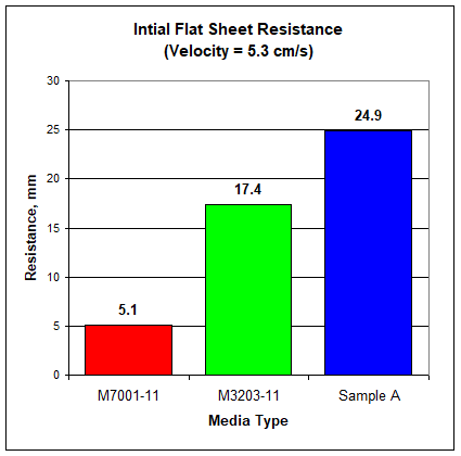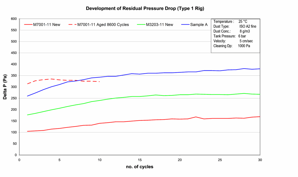 One of the key parameters measured by this testing is the increase in residual pressure drop over time. These tests were performed roughly in accordance with an accelerated version of VDI Guideline 3926 for flat sheet media.