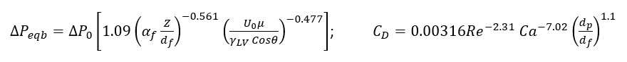 During the separation of two fluid streams with a continuous and a dispersed phase (ex. hydrocarbon oils-gas) using a fibrous coalescer media, the wettability of liquid drops on the media surface influences filtration performance. In the case of air filtration, like crankcase ventilation requirements, the droplets are captured by the substrate due to filtration mechanisms determined by the velocity regimes. After capture however, the growth, coalescence and drainage of liquid drops is highly dependent on surface wettability along with other flow parameters. Analytical modeling to predict the dynamic behavior in coalescence process is an ongoing endeavor with some work available for steady state conditions. One example of such a simplified analytical model is the one proposed by Liew and Conder, which is used to estimate pressure drop for a fibrous filter media under steady state conditions with constraints on packing density αf between 7.6% and 14% and fiber diameter df between 4 and 22 μm. Another example is the empirical correlation developed by the author and Chase to predict the drag coefficient of liquid drops on single fiber (where Re= Reynolds number and Ca=Capillary number).