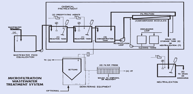 The wastewater from upstream flows by gravity or is pumped into a series of reaction tanks with relevant chemicals dosing and necessary pH/ORP monitoring. Gravity flow into the recirculation tank then takes place. The water with precipitated elements is drawn out of the tank by the process (recirculation) pump. The membrane filtration process separates the suspended solids from the liquid. The suspended solids are retained by the membranes and concentrated in the re-circulating stream and returned to the concentration or recirculation tank. Filtrated water that has passed thru the membranes goes to added processing or discharge. Sludge in the concentration tank is sent to filter press periodically by pneumatic pump.