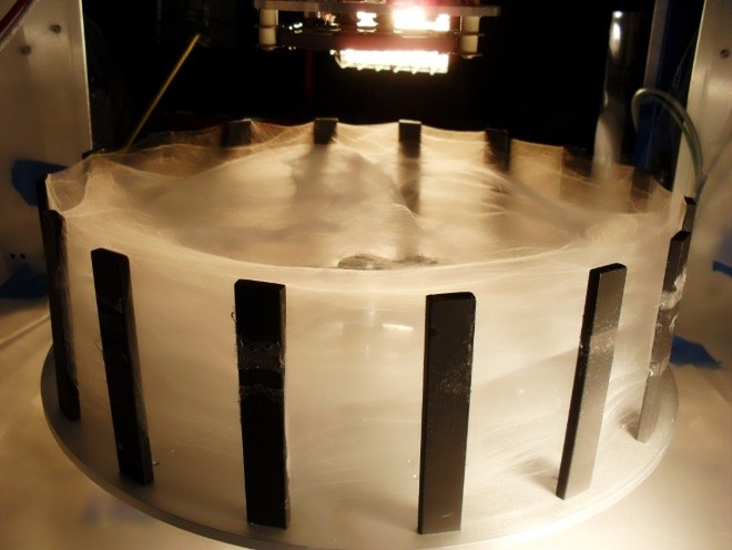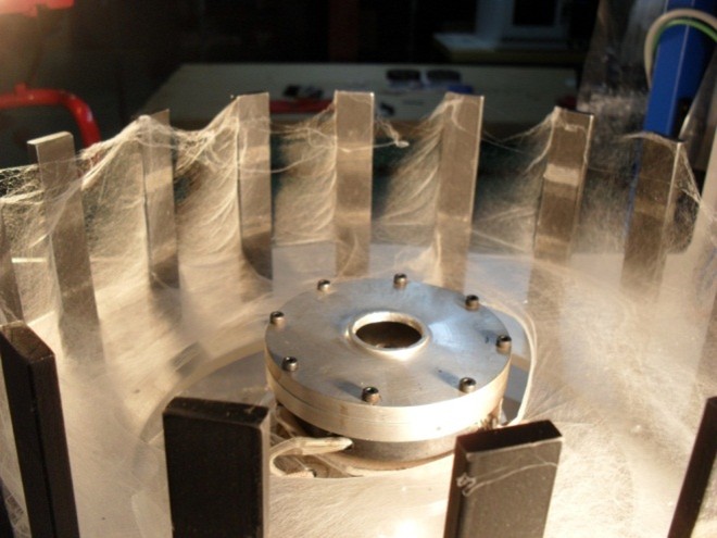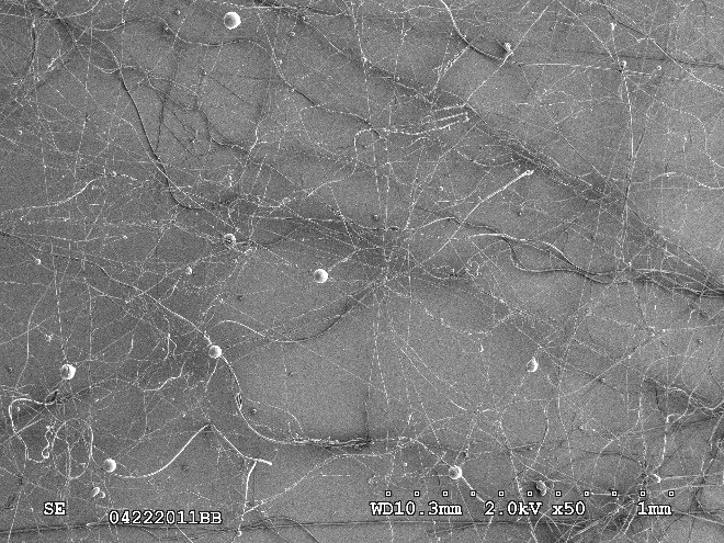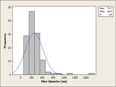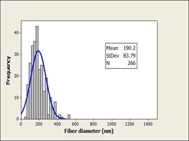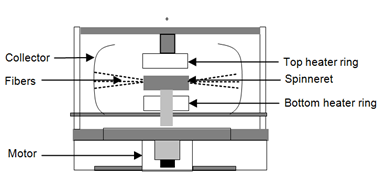 Figure 2 shows the schematic diagram of Cyclone L – 1000M system. This lab scale system has integrated solution spinning and melt spinning capability. Therefore, this system was used to fabricate both solution spun Nylon 6 nanofibers and melt spun Polypropylene nanofibers. For solution spinning, 20 wt% of Nylon 6 solution was spun at 7,000 rpm with a solution spinneret fitted with 30 G needle size at both ends for a time cycle of 1 minute (Figure 3(a)). Figure 3(b) shows the morphology of the Nylon 6 nanofibers collected under present experimental setup. The average diameter was found to be 190 + 84 nm. Fiber size distribution is plotted in Figure 3 (c). In the case of melt spinning, Polypropylene was melted inside a proprietary designed melt spinneret with the set of heater rings by applying radiant heat. Once the desired melting temperature of polymer was achieved, melt spinning was carried out at 12,000 rpm for 30 second time cycle (Figure 4(a)). The spinneret and heating system on Cyclone L – 1000 M is designed to withstand high temperature of up to 450 C.  For this study, melt spinning was carried out at 225 C. The corresponding fiber morphology of melt spun Polypropylene and fiber diameter distribution is shown in Figure 4 (b) and Figure 4(c).