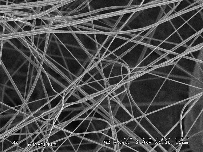The processing of polymers into nanofibers offers a broad range of applications in areas such as filtration, catalysis, tissue engineering scaffoliding, photonics and sensors. The centrifugal nanofiber processing called ForcespinningTM allows for fabrication of both solution and melt spun nanofibers [1-4]. Figure 1 shows the schematics of fiber formation using ForcespinningTM technology. The polymer solution or melt are forced through the orifices of the spinneret by applying centrifugal force. As polymer solution or melt is ejected through the orifices, continuous polymer jets are formed and are stretched into formation of fine web of fibers due to applied centrifugal force and shear force acting across the orifice tip. The web is collected on the custom designed collector system. The morphology and fiber diameter are determined by controlling the operating parameters such as:  solution concentration (in case of solution spinning), melt viscosity (for melt spinning), rotational speed of the spinneret, orifice size, temperature of the spinneret (for melt spinning), and collection system. By varying these parameters, fine control over the fiber diameter and morphology is possible.